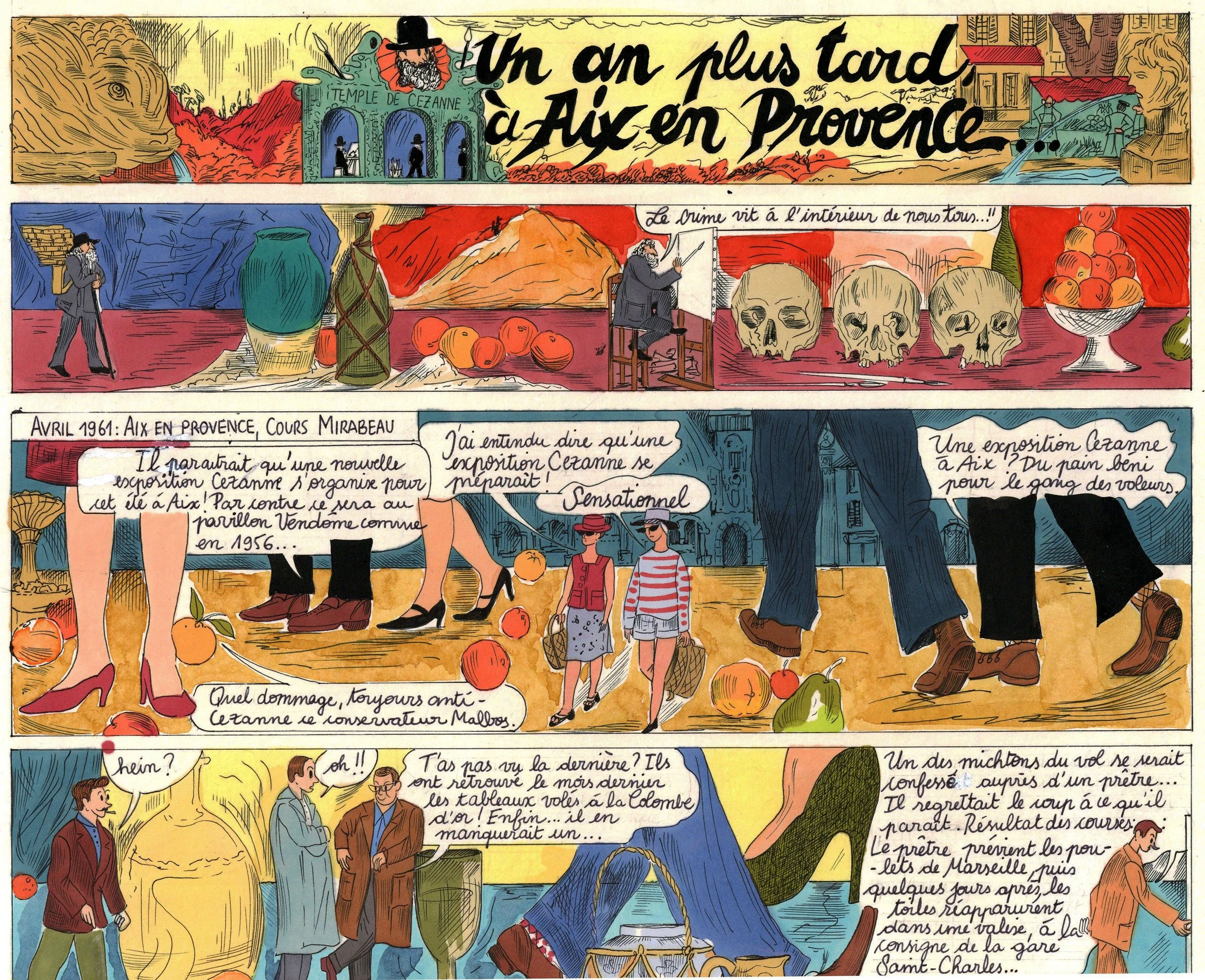 « Le mystère Cezanne : l’ombre du doute » . Voici la couverture de mon journal publié dans le cadre de #bdaix2025 et de #cezanne2025 à Aix en Provence! Il s’agit de la folle histoire de huit tableaux de Paul Cezanne volés dans la nuit du 12 au 13 Août 1961, au prestigieux pavillon Vendôme à Aix. C’est un vol tout à fait rocambolesque qui pointe la continuité d’une série de vol d’œuvres majeures sur la côte d’Azur dans les années 60. J’ai pour l’occasion aussi pu consulté les archives de la mairie d’Aix. Je me suis en suite tournée vers les archives de Marseille et les archives de la Police à Paris… et rien. Le mystère sur cette affaire reste entier à ce jour! Dans le journal je tente de décortiquer et d’exposer une version possible des faits, en restant s au plus proches des documents consultés ( comme d’habitude) pis j’y accorde un peu de fiction polaresque. Il y avait là vraiment tous les ingrédients d’un vrai polar des années 60. PLus d’information spar ici, sur le site des Rencontres du 9 art d’Aix :